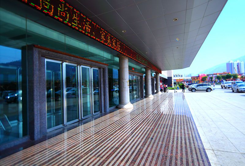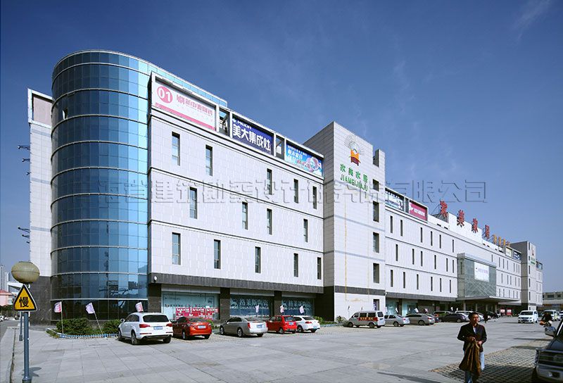 建筑體型為矩形,建筑立面窗采用亂碼窗的分割方式,石材幕墻錯(cuò)縫排列,并采用表面不同質(zhì)感的石材加強(qiáng)實(shí)體墻的視覺(jué)效果,窗與實(shí)體墻比例劃分恰當(dāng),分格細(xì)膩,體塊規(guī)整大氣,端莊得體,體現(xiàn)大型賣(mài)場(chǎng)建筑的性格特征。